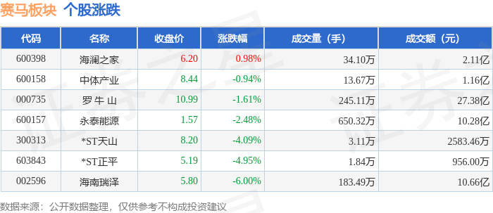证券之星消息,12月16日赛马板块较上一交易日下跌1.58%,海南瑞泽领跌。当日上证指数报收于3824.81,下跌1.11%。深证成指报收于12914.67,下跌1.51%。赛马板块个股涨跌见下表: