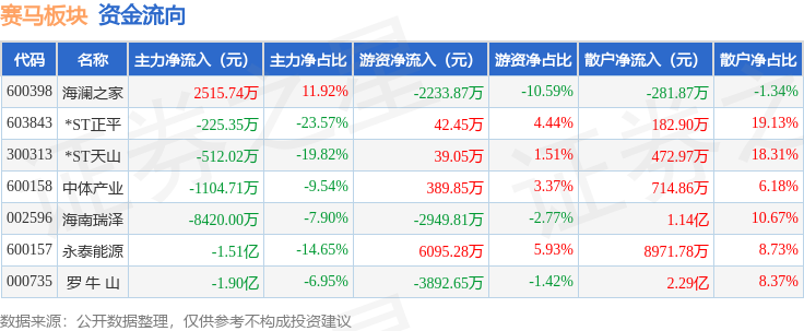 从资金流向上来看,当日赛马板块主力资金净流出4.18亿元,游资资金净流出2509.69万元,散户资金净流入4.44亿元。赛马板块个股资金流向见下表: