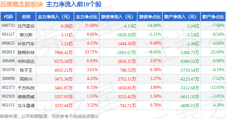 从资金流向上来看,当日百度概念股板块主力资金净流出32.27亿元,游资资金净流入6.4亿元,散户资金净流入25.87亿元。百度概念股板块个股资金流向见下表: