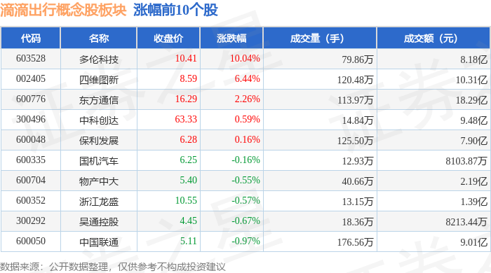 证券之星消息,12月16日滴滴出行概念股板块较上一交易日下跌1.36%,汉得信息领跌。当日上证指数报收于3824.81,下跌1.11%。深证成指报收于12914.67,下跌1.51%。滴滴出行概念股板块个股涨跌见下表: