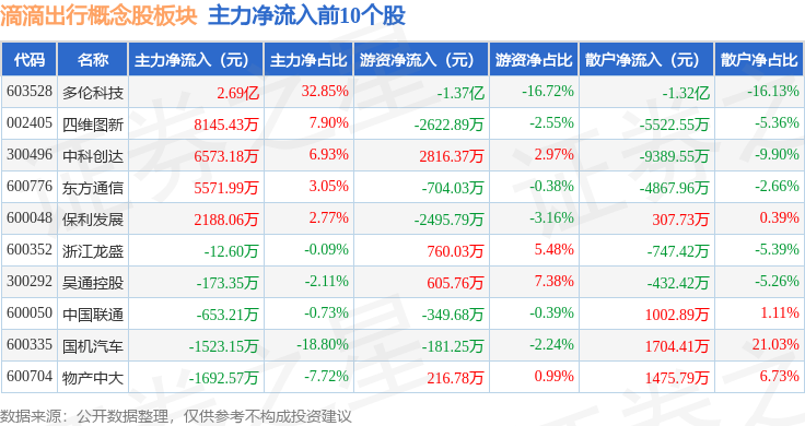从资金流向上来看,当日滴滴出行概念股板块主力资金净流入8005.63万元,游资资金净流出5872.84万元,散户资金净流出2132.79万元。滴滴出行概念股板块个股资金流向见下表:
