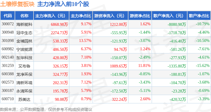 从资金流向上来看,当日土壤修复板块主力资金净流出8.44亿元,游资资金净流入9354.34万元,散户资金净流入7.51亿元。土壤修复板块个股资金流向见下表: