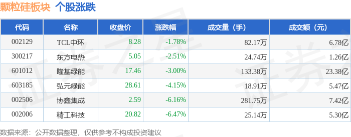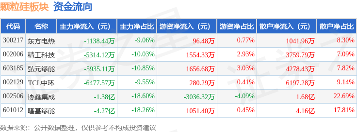 从资金流向上来看,当日颗粒硅板块主力资金净流出7.54亿元,游资资金净流入1602.87万元,散户资金净流入7.38亿元。颗粒硅板块个股资金流向见下表: