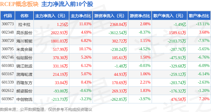 从资金流向上来看,当日RCEP概念板块主力资金净流出2416.21万元,游资资金净流出182.21万元,散户资金净流入2598.42万元。RCEP概念板块个股资金流向见下表:
