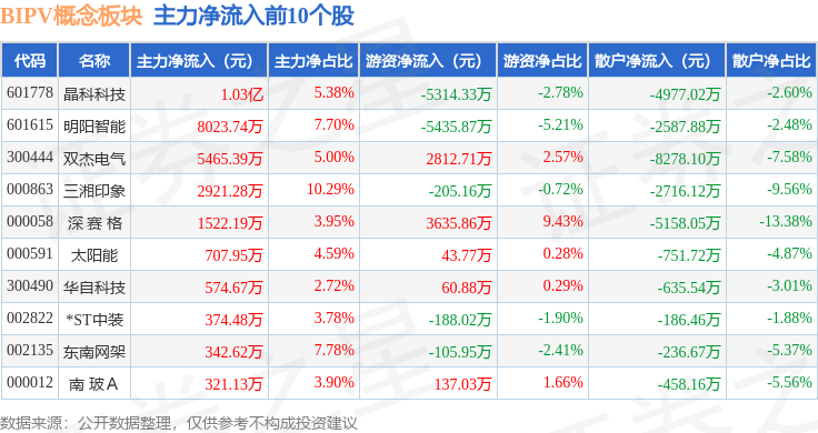 从资金流向上来看,当日BIPV概念板块主力资金净流出13.22亿元,游资资金净流入1.98亿元,散户资金净流入11.24亿元。BIPV概念板块个股资金流向见下表: