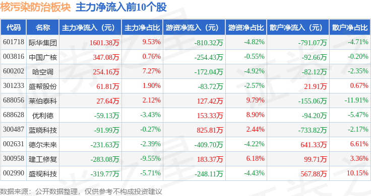 从资金流向上来看,当日核污染防治板块主力资金净流出14.53亿元,游资资金净流入2.33亿元,散户资金净流入12.19亿元。核污染防治板块个股资金流向见下表: