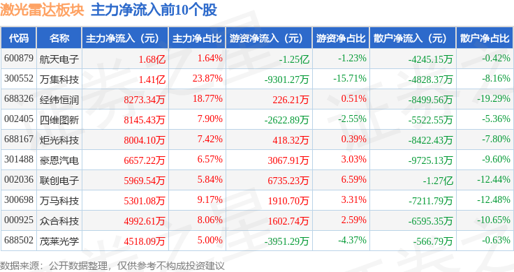 从资金流向上来看,当日激光雷达板块主力资金净流出61.02亿元,游资资金净流入35.94亿元,散户资金净流入25.08亿元。激光雷达板块个股资金流向见下表: