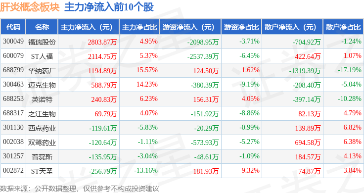 从资金流向上来看,当日肝炎概念板块主力资金净流出1.75亿元,游资资金净流出2761.24万元,散户资金净流入2.02亿元。肝炎概念板块个股资金流向见下表: