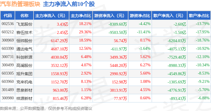 从资金流向上来看,当日汽车热管理板块主力资金净流出25.67亿元,游资资金净流入6.31亿元,散户资金净流入19.35亿元。汽车热管理板块个股资金流向见下表: