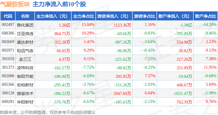 从资金流向上来看,当日气凝胶板块主力资金净流出2.27亿元,游资资金净流出158.17万元,散户资金净流入2.28亿元。气凝胶板块个股资金流向见下表: