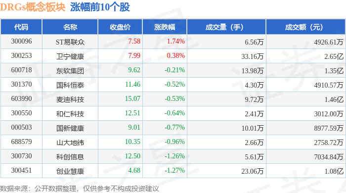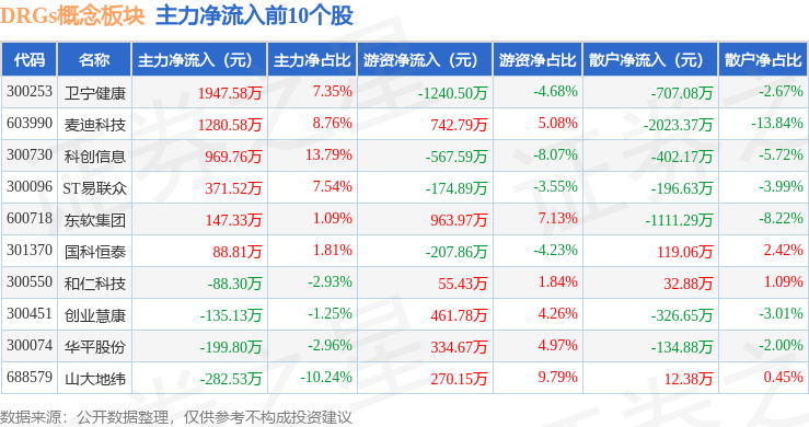 从资金流向上来看,当日DRGs概念板块主力资金净流出3.64亿元,游资资金净流入2229.81万元,散户资金净流入3.42亿元。DRGs概念板块个股资金流向见下表: