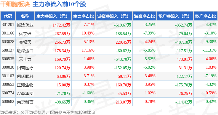 从资金流向上来看,当日干细胞板块主力资金净流出4.64亿元,游资资金净流入1.28亿元,散户资金净流入3.36亿元。干细胞板块个股资金流向见下表:
