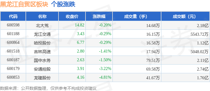 从资金流向上来看,当日黑龙江自贸区板块主力资金净流出5829.09万元,游资资金净流出1162.85万元,散户资金净流入6991.94万元。黑龙江自贸区板块个股资金流向见下表: