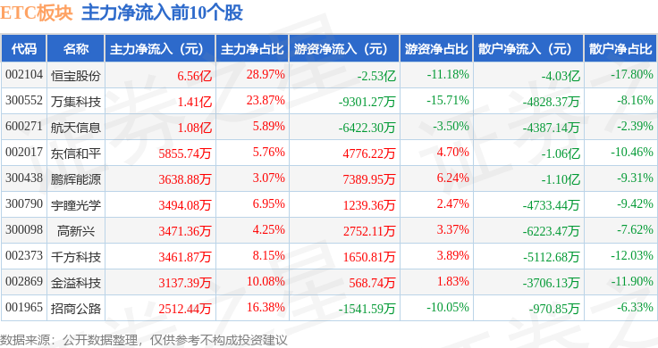 从资金流向上来看,当日ETC板块主力资金净流入6486.1万元,游资资金净流出2.92亿元,散户资金净流入2.27亿元。ETC板块个股资金流向见下表:
