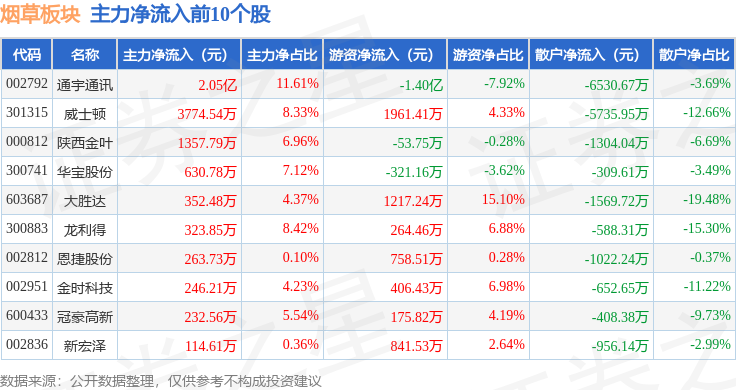 从资金流向上来看,当日烟草板块主力资金净流入1.08亿元,游资资金净流出2544.2万元,散户资金净流出8297.99万元。烟草板块个股资金流向见下表: