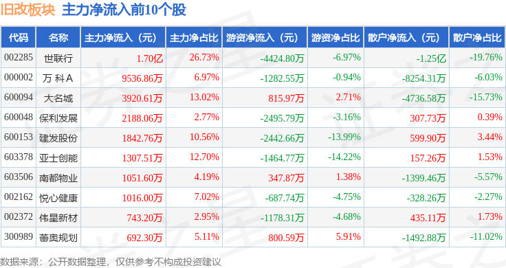 从资金流向上来看,当日旧改板块主力资金净流出7.04亿元,游资资金净流入2587.25万元,散户资金净流入6.78亿元。旧改板块个股资金流向见下表: