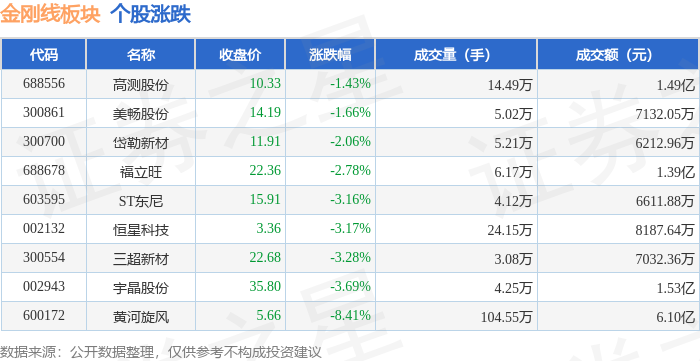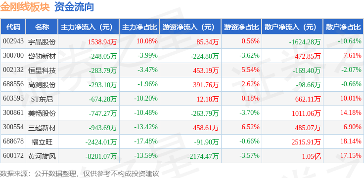 从资金流向上来看,当日金刚线板块主力资金净流出1.24亿元,游资资金净流出1353.88万元,散户资金净流入1.37亿元。金刚线板块个股资金流向见下表: