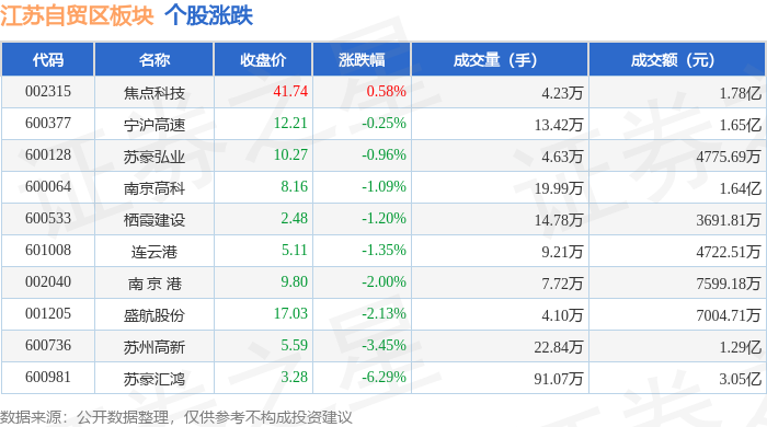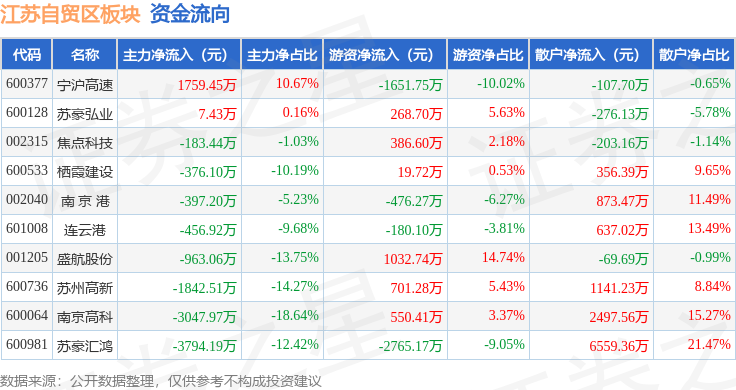 从资金流向上来看,当日江苏自贸区板块主力资金净流出9294.51万元,游资资金净流出2113.84万元,散户资金净流入1.14亿元。江苏自贸区板块个股资金流向见下表: