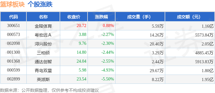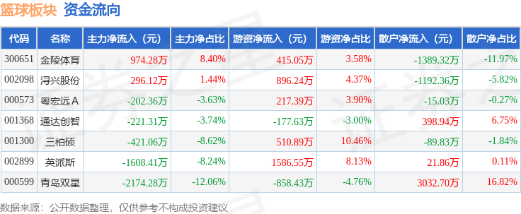从资金流向上来看,当日篮球板块主力资金净流出3357.02万元,游资资金净流入2590.05万元,散户资金净流入766.97万元。篮球板块个股资金流向见下表: