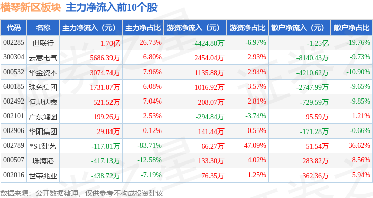 从资金流向上来看,当日横琴新区板块主力资金净流入119.88万元,游资资金净流入5009.76万元,散户资金净流出5129.64万元。横琴新区板块个股资金流向见下表: