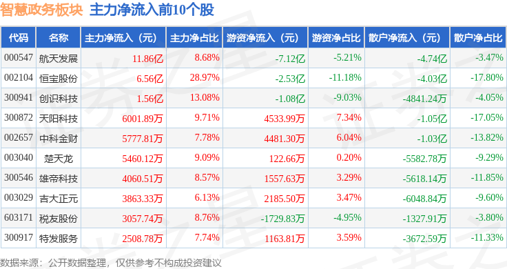 从资金流向上来看,当日智慧政务板块主力资金净流出5.63亿元,游资资金净流出9.14亿元,散户资金净流入14.77亿元。智慧政务板块个股资金流向见下表: