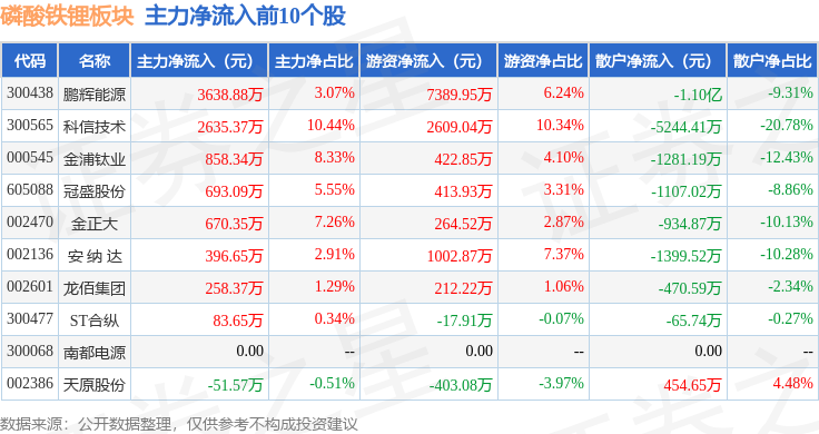 从资金流向上来看,当日磷酸铁锂板块主力资金净流出32.0亿元,游资资金净流出3.07亿元,散户资金净流入35.07亿元。磷酸铁锂板块个股资金流向见下表:
