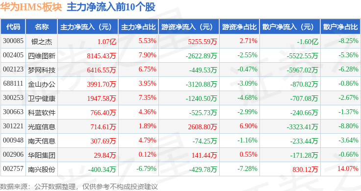 从资金流向上来看,当日华为HMS板块主力资金净流出9632.18万元,游资资金净流入4785.99万元,散户资金净流入4846.19万元。华为HMS板块个股资金流向见下表: