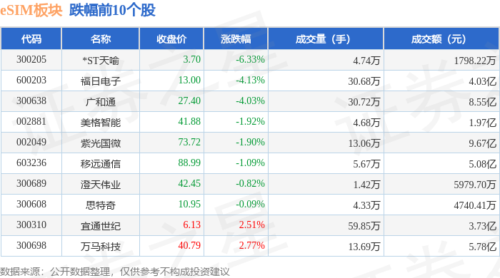 证券之星消息,12月16日eSIM板块较上一交易日下跌0.17%,*ST天喻领跌。当日上证指数报收于3824.81,下跌1.11%。深证成指报收于12914.67,下跌1.51%。eSIM板块个股涨跌见下表: