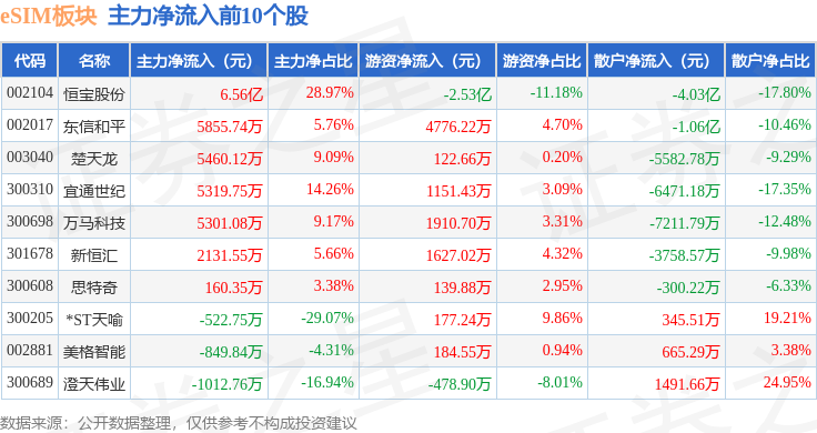 从资金流向上来看,当日eSIM板块主力资金净流入4.91亿元,游资资金净流出1.22亿元,散户资金净流出3.69亿元。eSIM板块个股资金流向见下表: