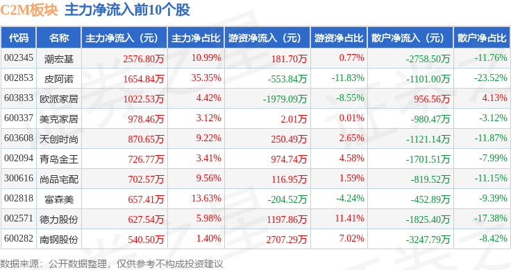 从资金流向上来看,当日C2M板块主力资金净流出2.77亿元,游资资金净流入1.93亿元,散户资金净流入8320.68万元。C2M板块个股资金流向见下表: