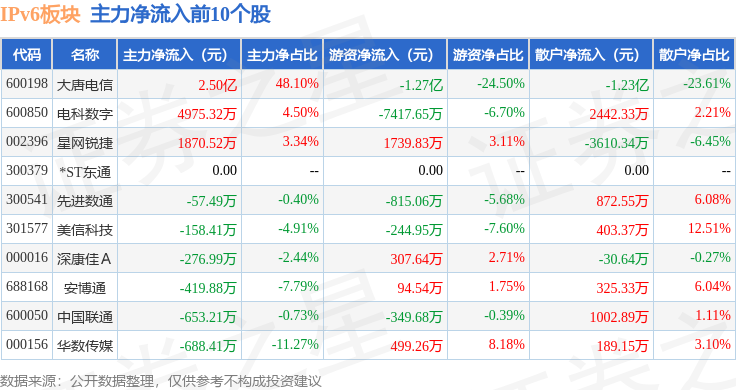 从资金流向上来看,当日IPv6板块主力资金净流出21.62亿元,游资资金净流入3.17亿元,散户资金净流入18.44亿元。IPv6板块个股资金流向见下表: