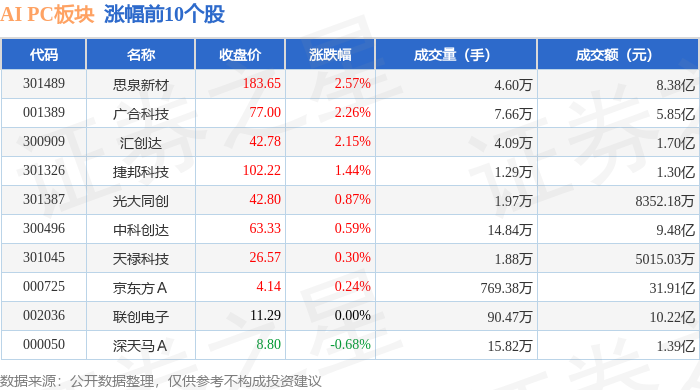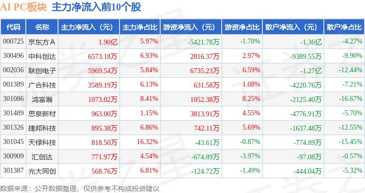 从资金流向上来看,当日AI PC板块主力资金净流出8.73亿元,游资资金净流入2.2亿元,散户资金净流入6.53亿元。AI PC板块个股资金流向见下表: