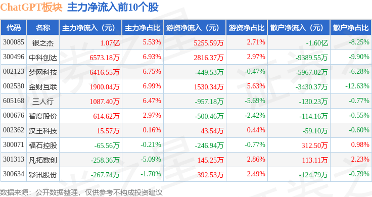 从资金流向上来看,当日ChatGPT板块主力资金净流出17.72亿元,游资资金净流入2.74亿元,散户资金净流入14.97亿元。ChatGPT板块个股资金流向见下表: