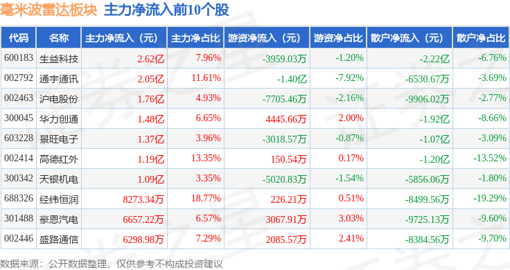 从资金流向上来看,当日毫米波雷达板块主力资金净流出12.36亿元,游资资金净流入7.03亿元,散户资金净流入5.33亿元。毫米波雷达板块个股资金流向见下表: