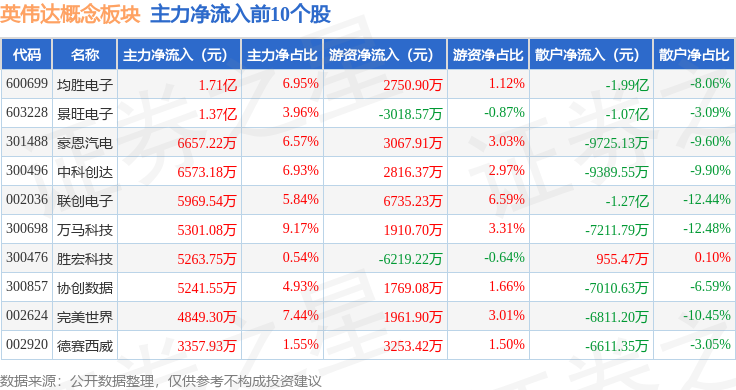 从资金流向上来看,当日英伟达概念板块主力资金净流出48.27亿元,游资资金净流入34.76亿元,散户资金净流入13.51亿元。英伟达概念板块个股资金流向见下表: