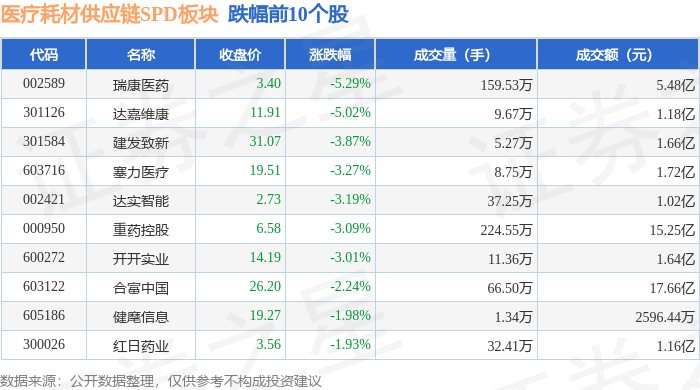 证券之星消息,12月16日医疗耗材供应链SPD板块较上一交易日下跌1.66%,瑞康医药领跌。当日上证指数报收于3824.81,下跌1.11%。深证成指报收于12914.67,下跌1.51%。医疗耗材供应链SPD板块个股涨跌见下表: