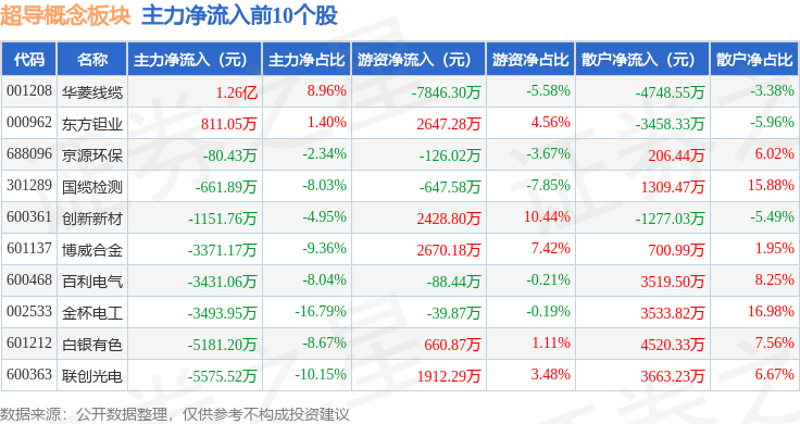从资金流向上来看,当日超导概念板块主力资金净流出17.97亿元,游资资金净流入2.69亿元,散户资金净流入15.29亿元。超导概念板块个股资金流向见下表:
