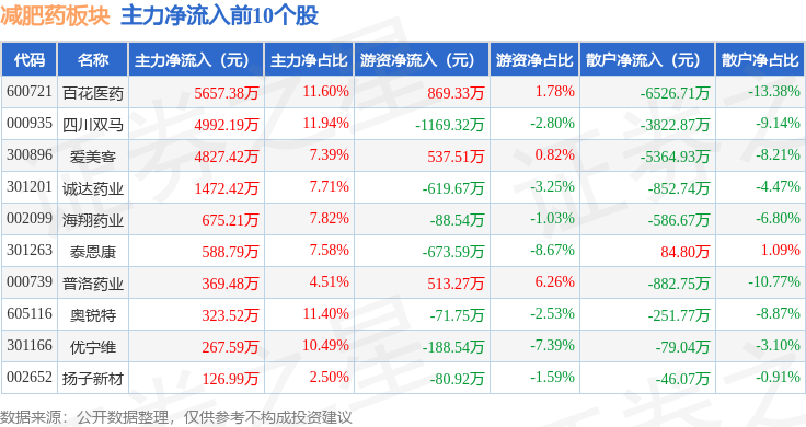 从资金流向上来看,当日减肥药板块主力资金净流出11.56亿元,游资资金净流入3.12亿元,散户资金净流入8.44亿元。减肥药板块个股资金流向见下表: