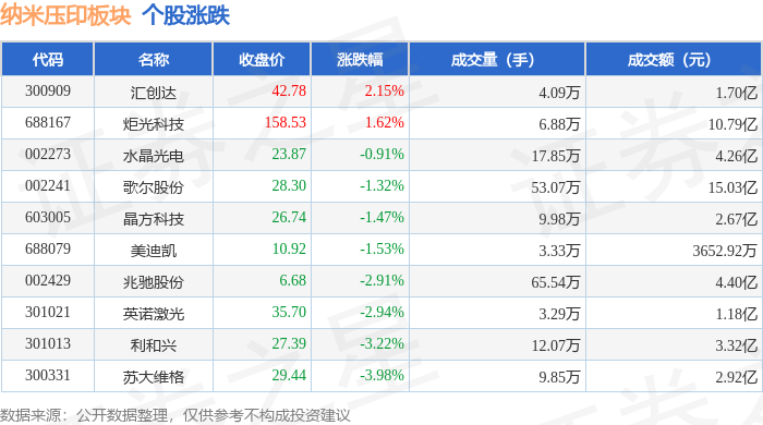 证券之星消息,12月16日纳米压印板块较上一交易日下跌1.4%,苏大维格领跌。当日上证指数报收于3824.81,下跌1.11%。深证成指报收于12914.67,下跌1.51%。纳米压印板块个股涨跌见下表: