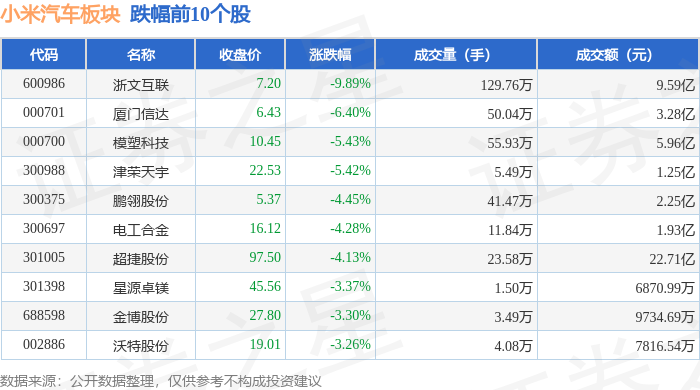 证券之星消息,12月16日小米汽车板块较上一交易日下跌1.78%,浙文互联领跌。当日上证指数报收于3824.81,下跌1.11%。深证成指报收于12914.67,下跌1.51%。小米汽车板块个股涨跌见下表: