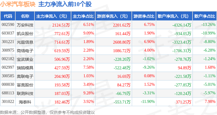 从资金流向上来看,当日小米汽车板块主力资金净流出18.43亿元,游资资金净流入2.43亿元,散户资金净流入15.99亿元。小米汽车板块个股资金流向见下表:
