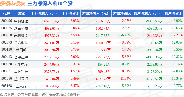 从资金流向上来看,当日多模态板块主力资金净流出27.01亿元,游资资金净流入6.17亿元,散户资金净流入20.85亿元。多模态板块个股资金流向见下表:
