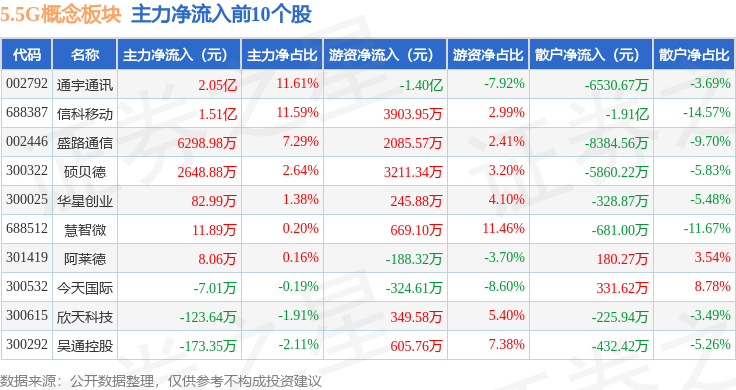 从资金流向上来看,当日5.5G概念板块主力资金净流出9.19亿元,游资资金净流入3994.73万元,散户资金净流入8.79亿元。5.5G概念板块个股资金流向见下表: