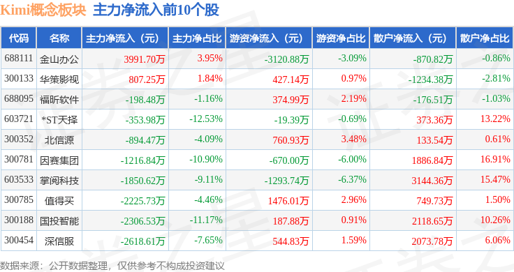 从资金流向上来看,当日Kimi概念板块主力资金净流出6.98亿元,游资资金净流入1.25亿元,散户资金净流入5.73亿元。Kimi概念板块个股资金流向见下表: