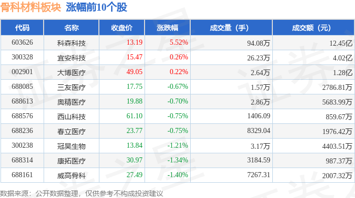 从资金流向上来看,当日骨科材料板块主力资金净流入1.37亿元,游资资金净流出802.6万元,散户资金净流出1.29亿元。骨科材料板块个股资金流向见下表:
