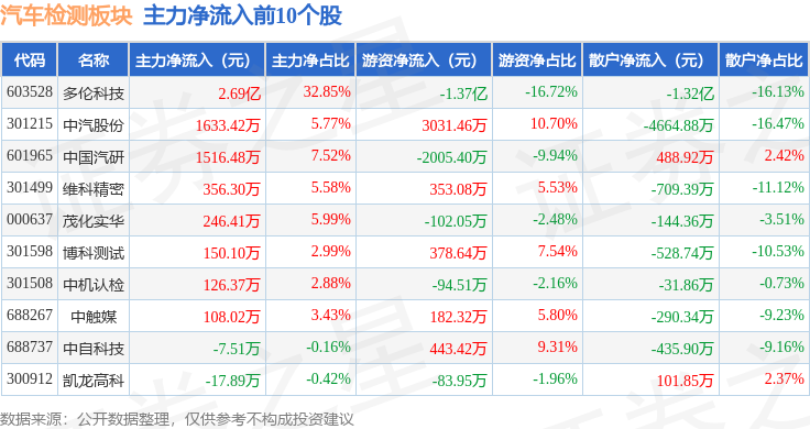 从资金流向上来看,当日汽车检测板块主力资金净流出3190.27万元,游资资金净流出1.8亿元,散户资金净流入2.12亿元。汽车检测板块个股资金流向见下表: