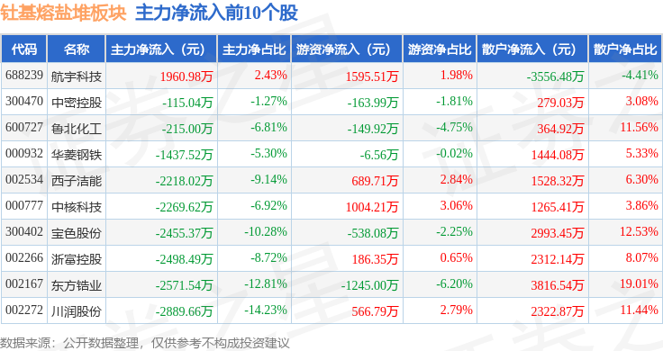 从资金流向上来看,当日钍基熔盐堆板块主力资金净流出14.05亿元,游资资金净流入2.15亿元,散户资金净流入11.91亿元。钍基熔盐堆板块个股资金流向见下表: