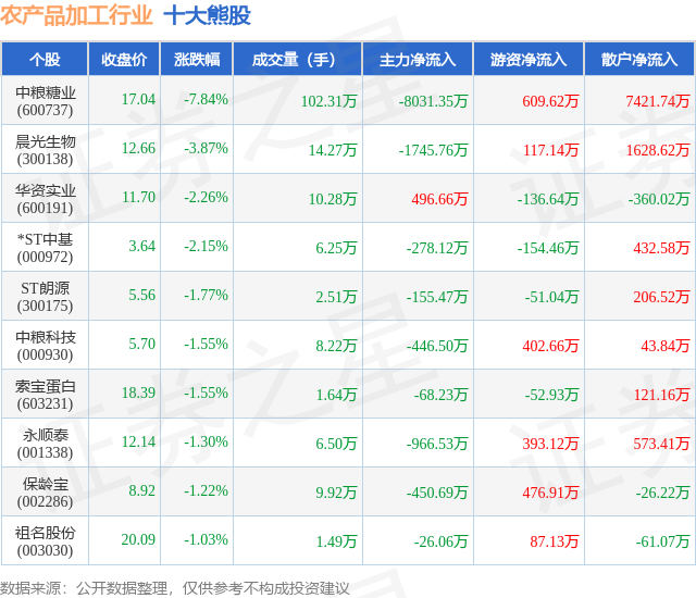 个股表现方面,农产品加工行业当日领跌股为中粮糖业(600737),该股当日报收17.04,下跌7.84%,成交量102.31万,主力资金净流出8031.35万元。晨光生物(300138)以下跌3.87%紧随其后,该股当日成交量14.27万,主力资金净流出1745.76万元。除此之外,华资实业(600191)、*ST中基(000972)、ST朗源(300175)均进入当日熊股之列。具体个股列表见下表: