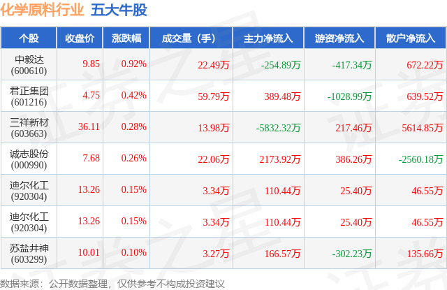 个股表现方面,化学原料行业当日领涨股为中毅达(600610),该股当日报收9.85,上涨0.92%,成交量22.49万,主力资金净流出254.89万元。君正集团(601216)以上涨0.42%紧随其后,该股当日成交量59.79万,主力资金净流入389.48万元。除此之外,三祥新材(603663)、诚志股份(000990)、迪尔化工(920304)均进入当日牛股之列。具体个股列表见下表:
