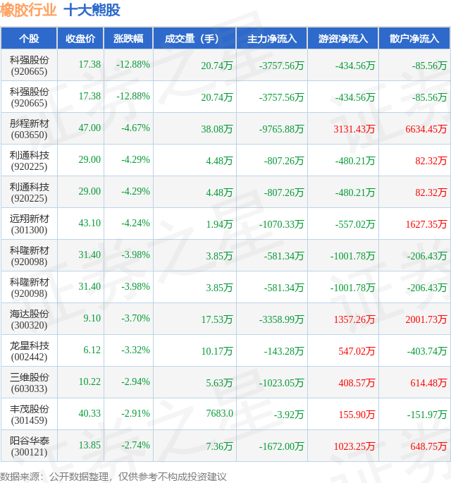 个股表现方面,橡胶行业当日领跌股为科强股份(920665),该股当日报收17.38,下跌12.88%,成交量20.74万,主力资金净流出3757.56万元。科强股份(920665)以下跌12.88%紧随其后,该股当日成交量20.74万,主力资金净流出3757.56万元。除此之外,彤程新材(603650)、利通科技(920225)、利通科技(920225)均进入当日熊股之列。具体个股列表见下表:
